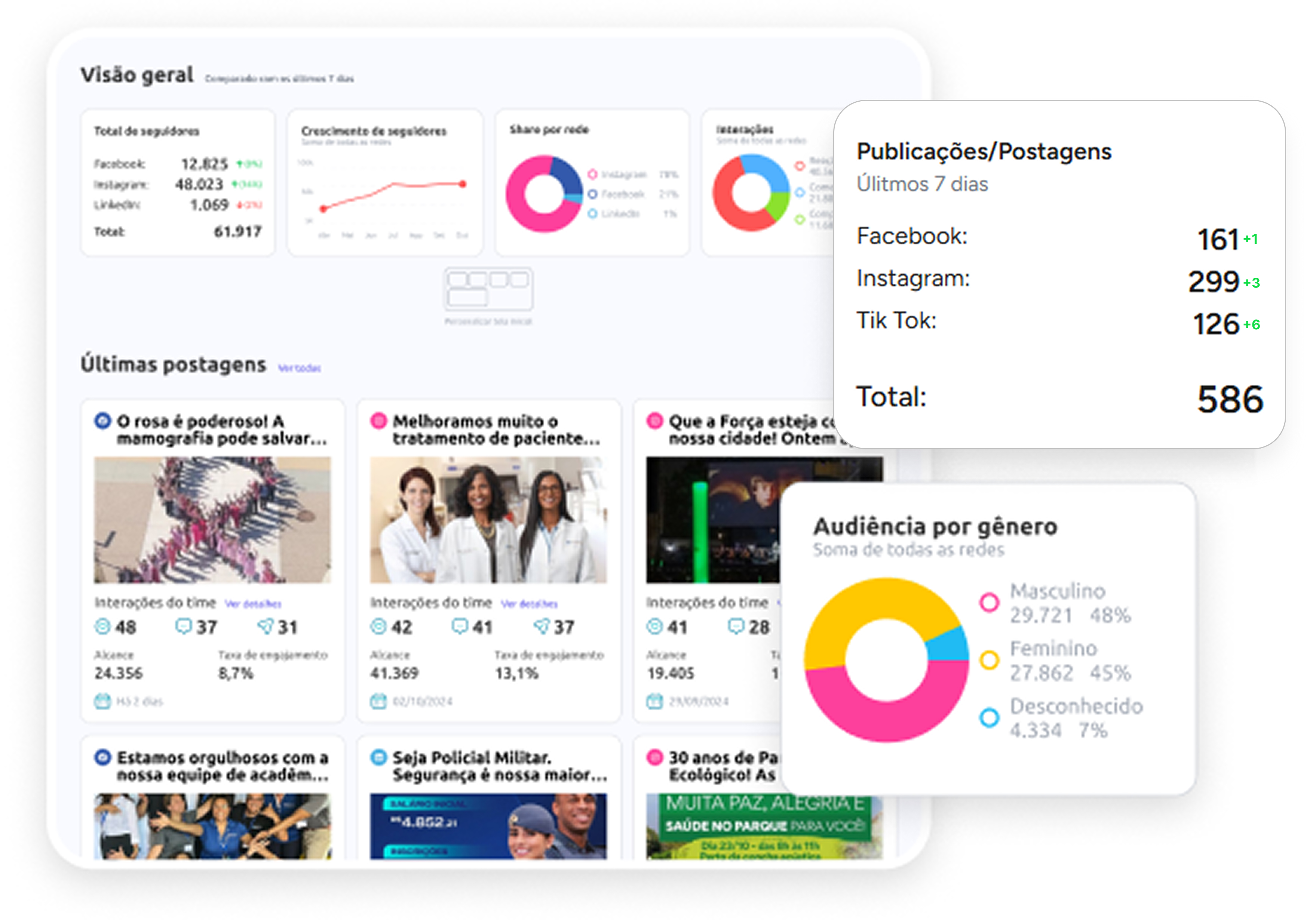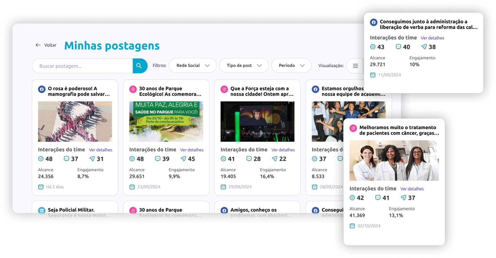 Utilize os filtros para buscar ou ordenar posts por rede social, tipo de post, alcance e engajamento, ou filtre por período de publicação.