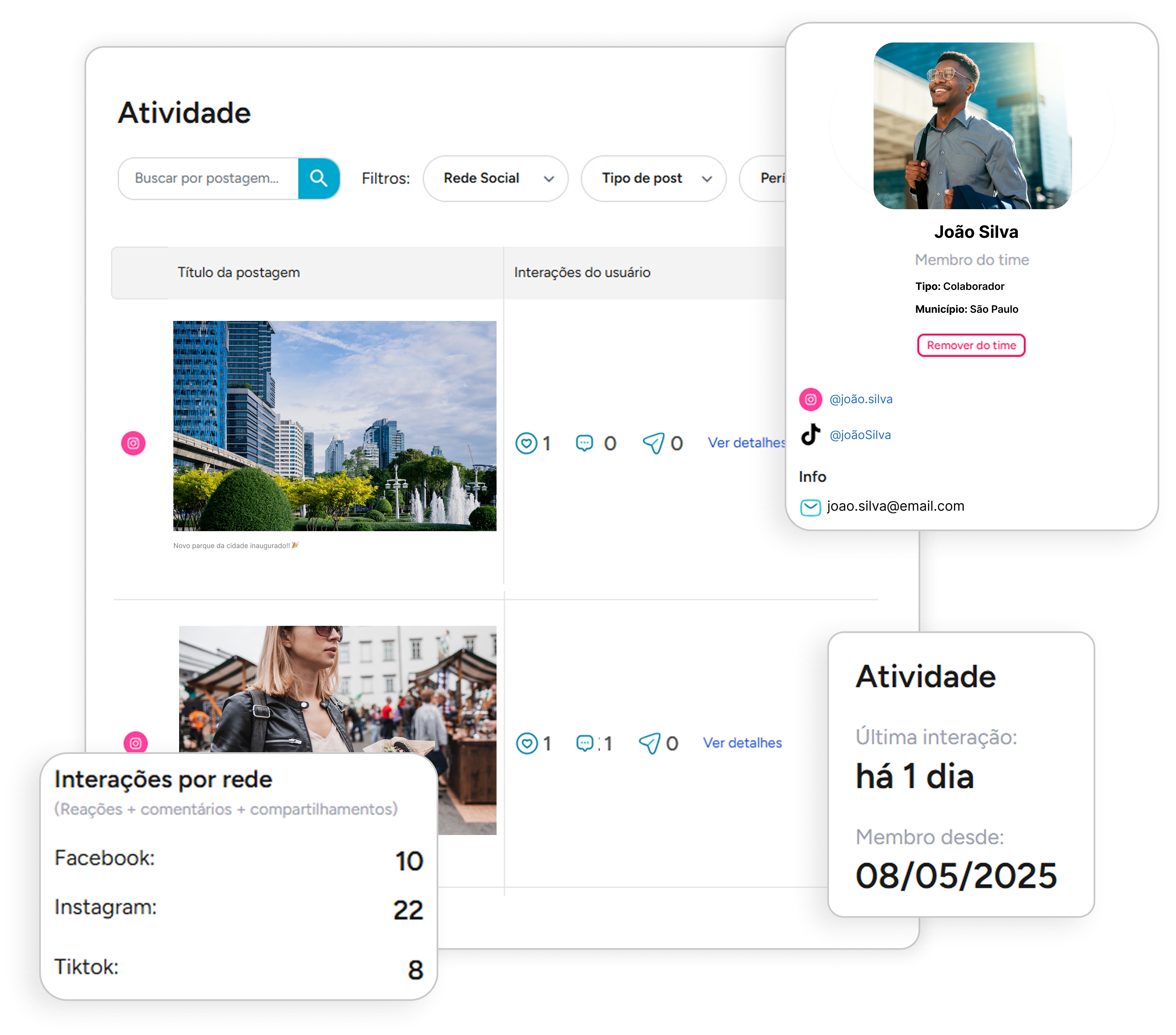 Veja as interações do seu time: curtidas, comentários e compartilhamentos de cada pessoa por post que você publica.