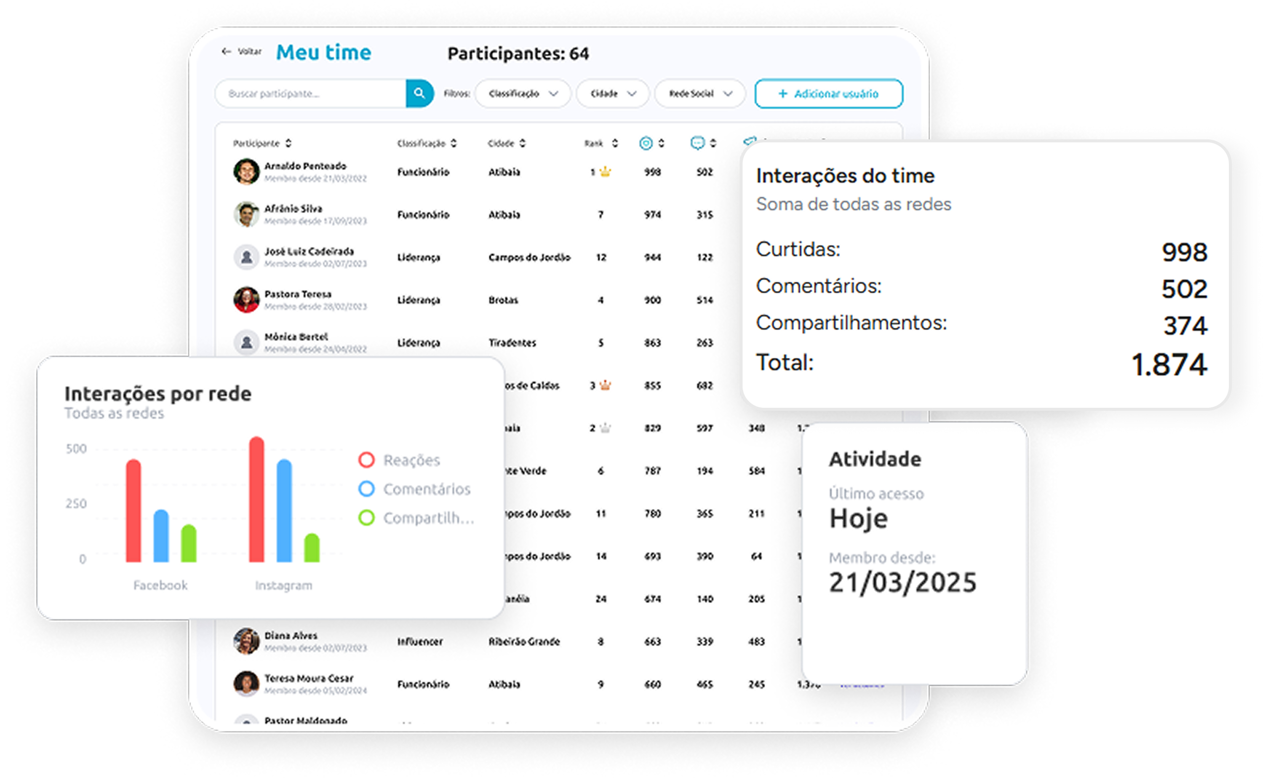 Comece a usar agora mesmo e acompanhe o engajamento do seu time nas suas redes sociais.