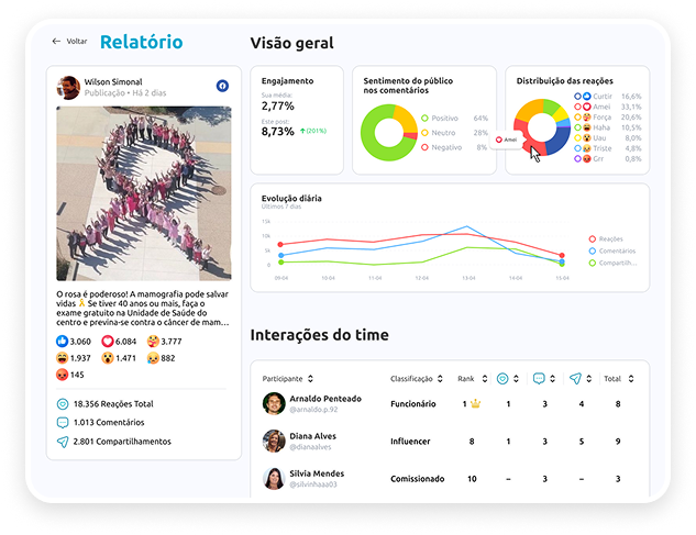 Receba relatórios diários com informações sobre o engajamento do seu time com cada uma das suas publicações.